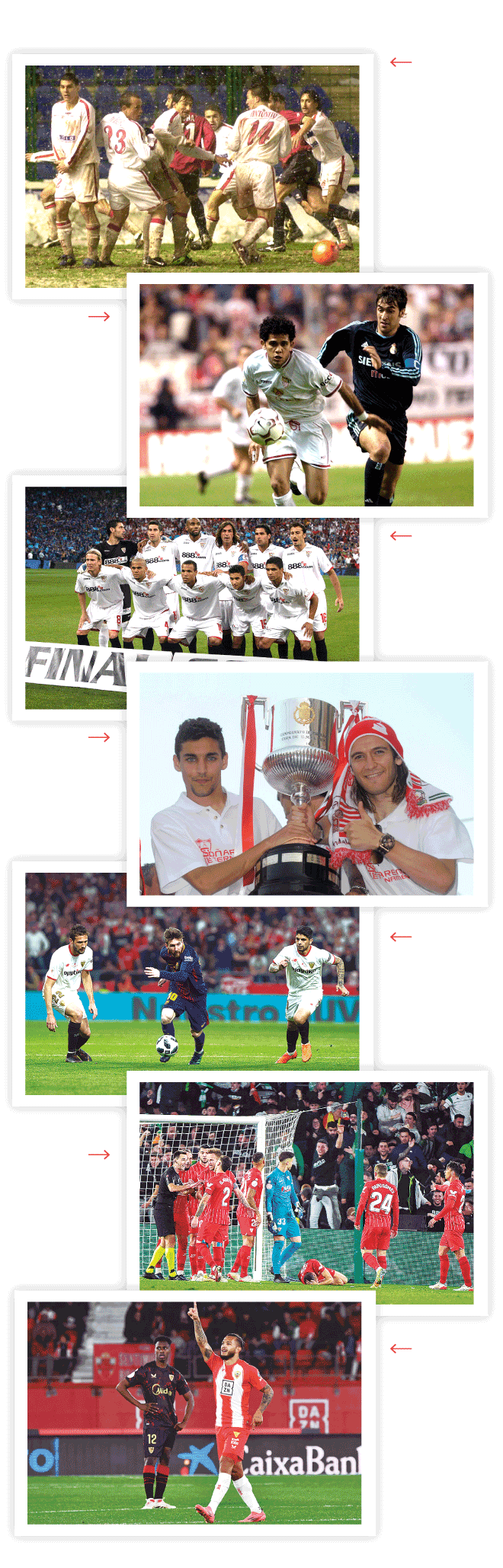 Con Montella en el banquillo, en el primer año sin Monchi en la dirección deportiva, el equipo alcanzó los cuartos de Champions y la final en la Copa del Rey, pese a su irregular camino en Liga. La cuestión es que en aquella final fueron absolutamente superados por el Barcelona, con un 5-0 que escoció en lo más profundo del sevillismo, que veían como su equipo campeón y de verdadero gen competitivo se comenzaba a deshacer pese a plantarse en una nueva final. Otra vez el Barça, en los cuartos del año siguiente, echó al Sevilla remontando un 2-0 de la ida (con muchos suplentes) con un incontestable 6-1. Era medirse a los catalanes y salir temblando los sevillistas. Quedaría otro duelo de ingrato recuerdo.